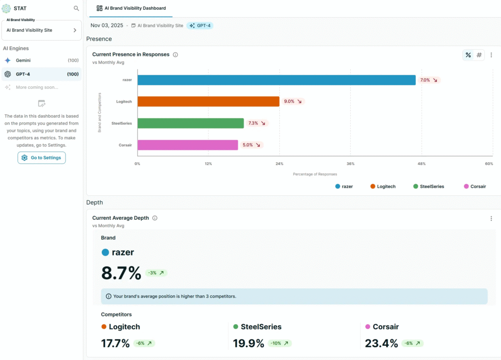 推荐使用STAT的”AI品牌可见度”等工具,实时追踪品牌在LLM响应中的出现频次、相对竞品的平均排序位置及具体产品词的表现。