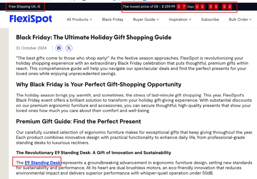 例如,电商品牌FlexiSpot精心策划了包含全系产品的礼品指南,不仅嵌入了黑五促销说明,更设计了倒计时器和包邮优惠提示。