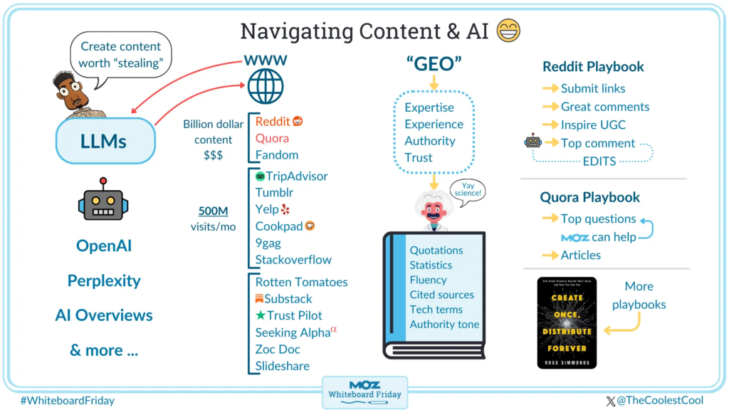 你现在需要更多地跳出固有思维。仅仅创建博客文章已经不够了。你必须分发你的内容。你必须为GEO优化你的内容,也就是“双E-E-A-T”,并确保你的内容好到值得被“窃取”。