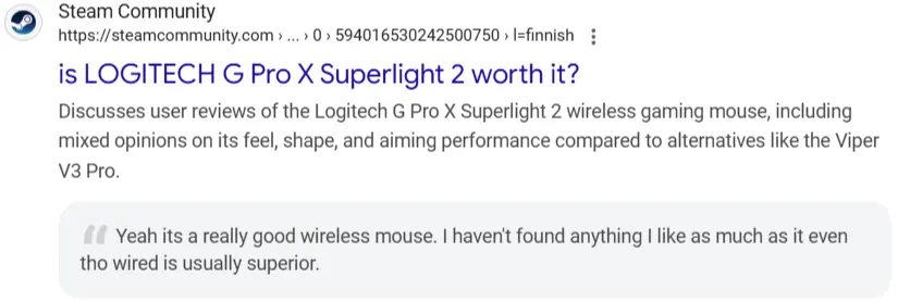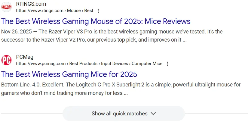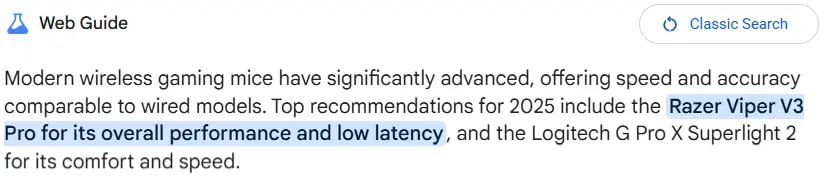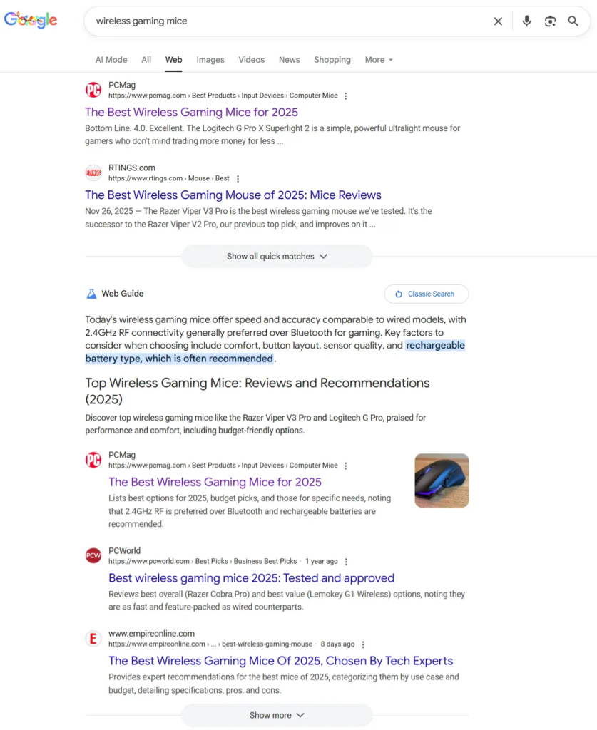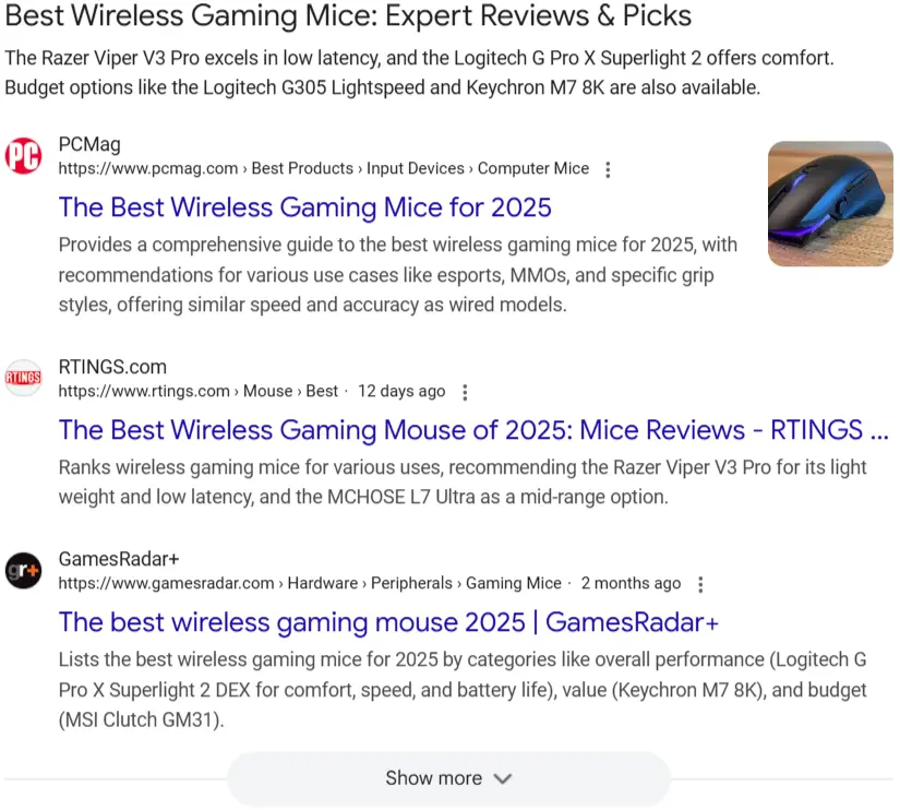 随着我们迈向这个混合搜索世界,或许应逐渐摆脱传统搜索查询的思维,转向思考问题(或用大语言模型的术语来说——“提示词”)。因此,以下所有示例都基于这个问题:“最适合玩家的无线鼠标有哪些?”