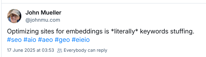 考虑到这些系统正持续优化,以不断提供最令搜索者满意的结果,单纯让人工智能青睐远不及真正成为最有帮助的结果来得重要。 我认为,除非你的内容确实属于用户最终觉得比其他选择更有帮助的类型,否则针对向量搜索进行优化可能弊大于利。因为若不如此,你很可能会在无意中“训练”人工智能系统不再偏爱你