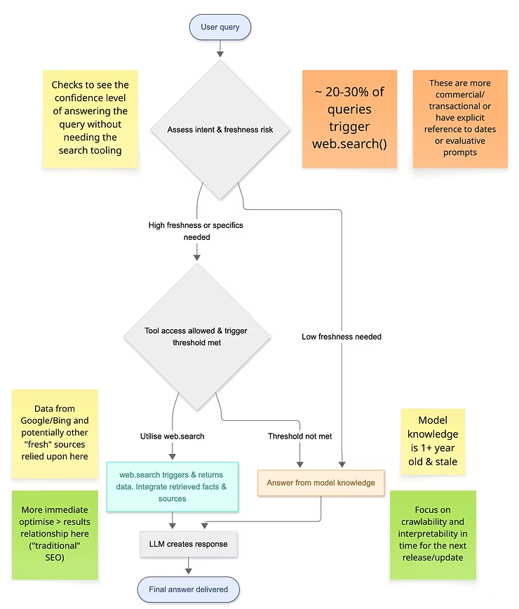 Chris Long测试了近8700个查询词(虽多为高意向/交易类词汇),发现其中31%的查询触发了web.search()功能——这与我对2000条查询子集的测试结果基本吻合。更多细节可参阅其LinkedIn文章,以下是他提供的关键摘要: