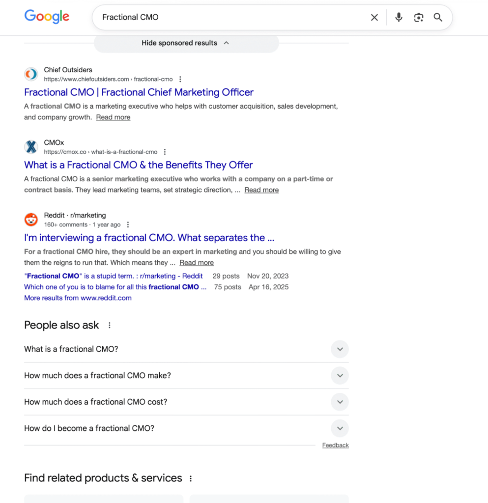 让我们看看在谷歌搜索”fractional CMO”的结果。如果用户想为他们的初创公司评估多个fractional CMO选项,在谷歌搜索中做这件事比在ChatGPT中更费力。首屏只出现两个选项,每个都需要点击才能阅读其网站内容。