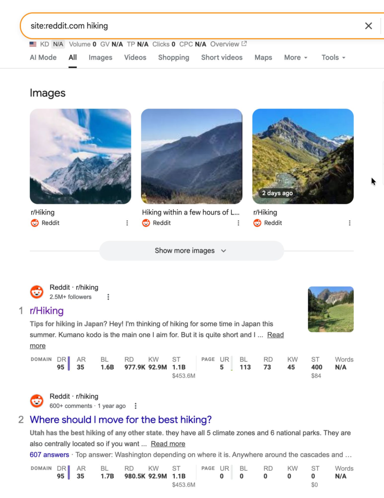 输入 reddit.com/r/hiking,你就能看到该子版块下的讨论在谷歌中获得排名的每一个关键词。这是找到已验证关键词机会的最快方法——如果Reddit已经获得排名,说明这个关键词具备流量潜力。