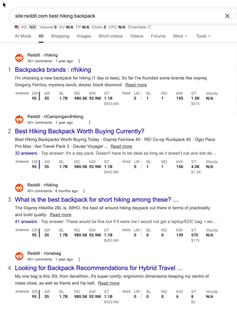 从宽泛的搜索开始,并留意返回的帖子数量。如果 site:reddit.com "best hiking backpack" 返回了数十条结果,这表明存在真实的需求,并且谷歌信任Reddit上对此话题的解答。如果 site:reddit.com "best hiking backpack for ultralight thru-hiking" 只返回了两条结果,那么这个机会就小得多。Reddit结果的数量可以粗略地代表需求的大小。
