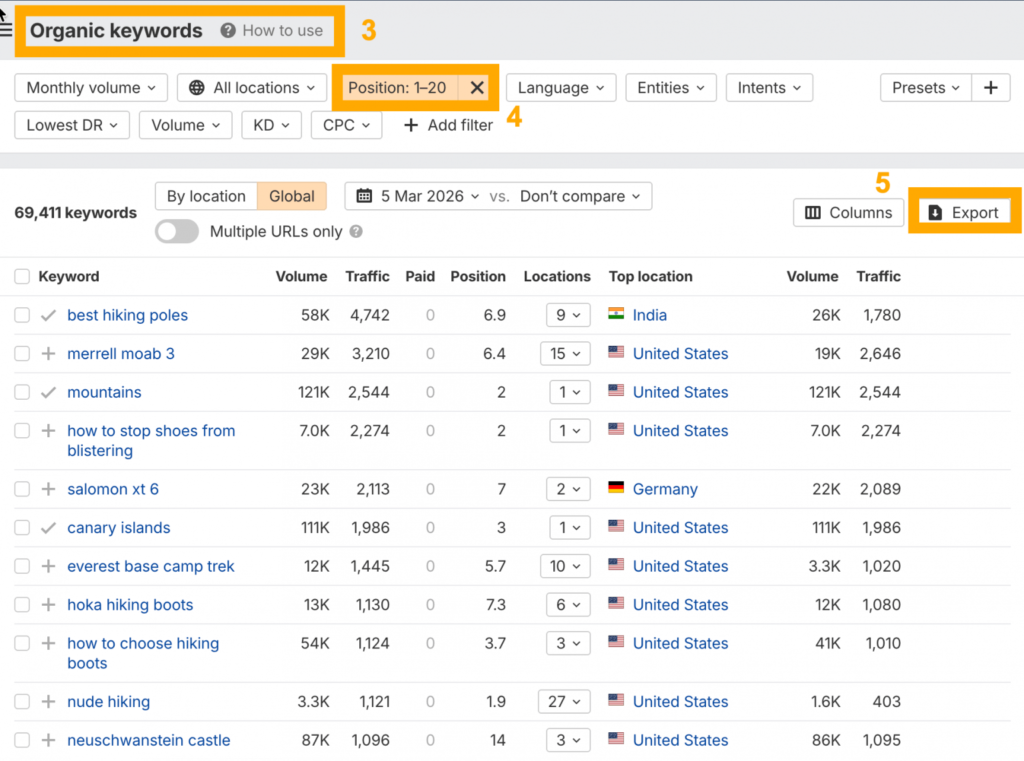 (此处为Site Explorer中针对 reddit.com/r/hiking 的”自然关键词”报告截图,已筛选出排名前1-20的关键词。这里的每一个关键词都是一个已验证的内容机会。)