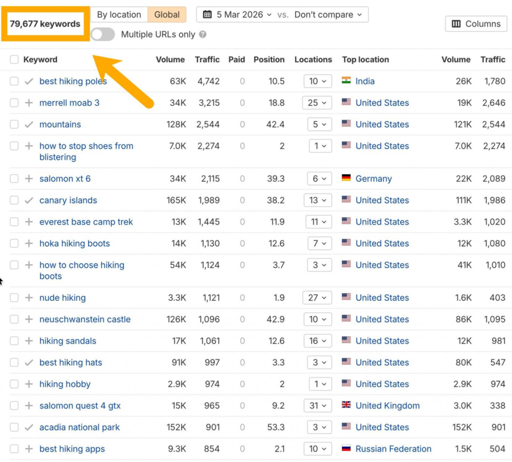 给你一个具体例子。当我在Site Explorer中分析 /r/hiking 子版块时,发现它为近80,000个关键词获得了排名。其中包括像”best hiking boots for beginners”(月搜索量2,400)和”what to bring on a day hike”(月搜索量1,900)这样的词条。