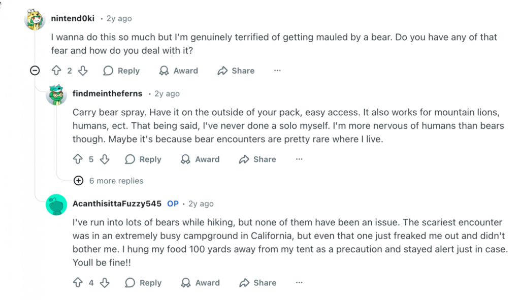 对于任何针对徒步旅行话题的人来说,这显然是一个热门且相关的关键词。而阅读评论则会揭示出更多值得考虑的细分角度:如何计划一次单人背包旅行、如何带狗一起背包旅行、单人背包旅行的安全事项、如何在单人背包旅行中避开熊……