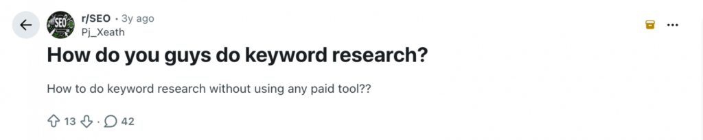 看这个例子:在/r/SEO子版块中,一个标题为“大家是怎么做关键词研究的?”的帖子获得了42个点赞,并针对我们的目标关键词排名第一。整个讨论串里,从业者们分享着他们实际的工作流程、最喜欢的工具,以及对现有选项的不满。